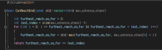 현재 위치에서 최대한 멀리 나아가는 것이 중요하므로 가장 멀리 나아갔던 경우와 i위치에서의 i+A[i] 값을 비교하여 큰 값이 마지막 위치에 다다를 수 있는지를 판단하는게 중요하다.