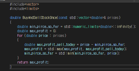 어떤 회사의 일일 주식 가격이 배열로 주어졌을 때 한 주를 한번 사고팔아서 남길 수 있는 최대 이익을 구하는 프로그램을 구해 보자.