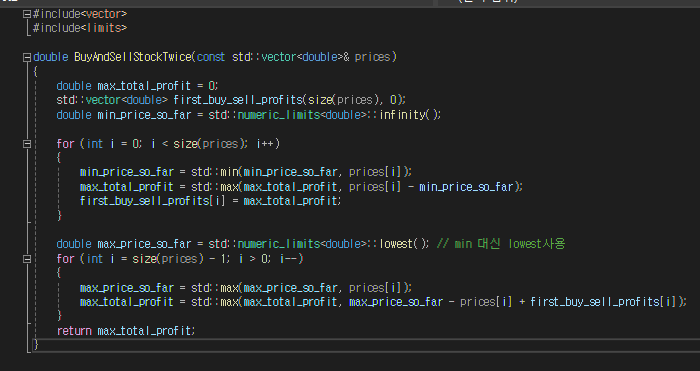 뒤에서 부터 주식을 해당 날짜에 팔았을 경우의 최대 이익도 구한뒤 두 값을 더해 최대 이익을 구하는 방법을 이용하자.